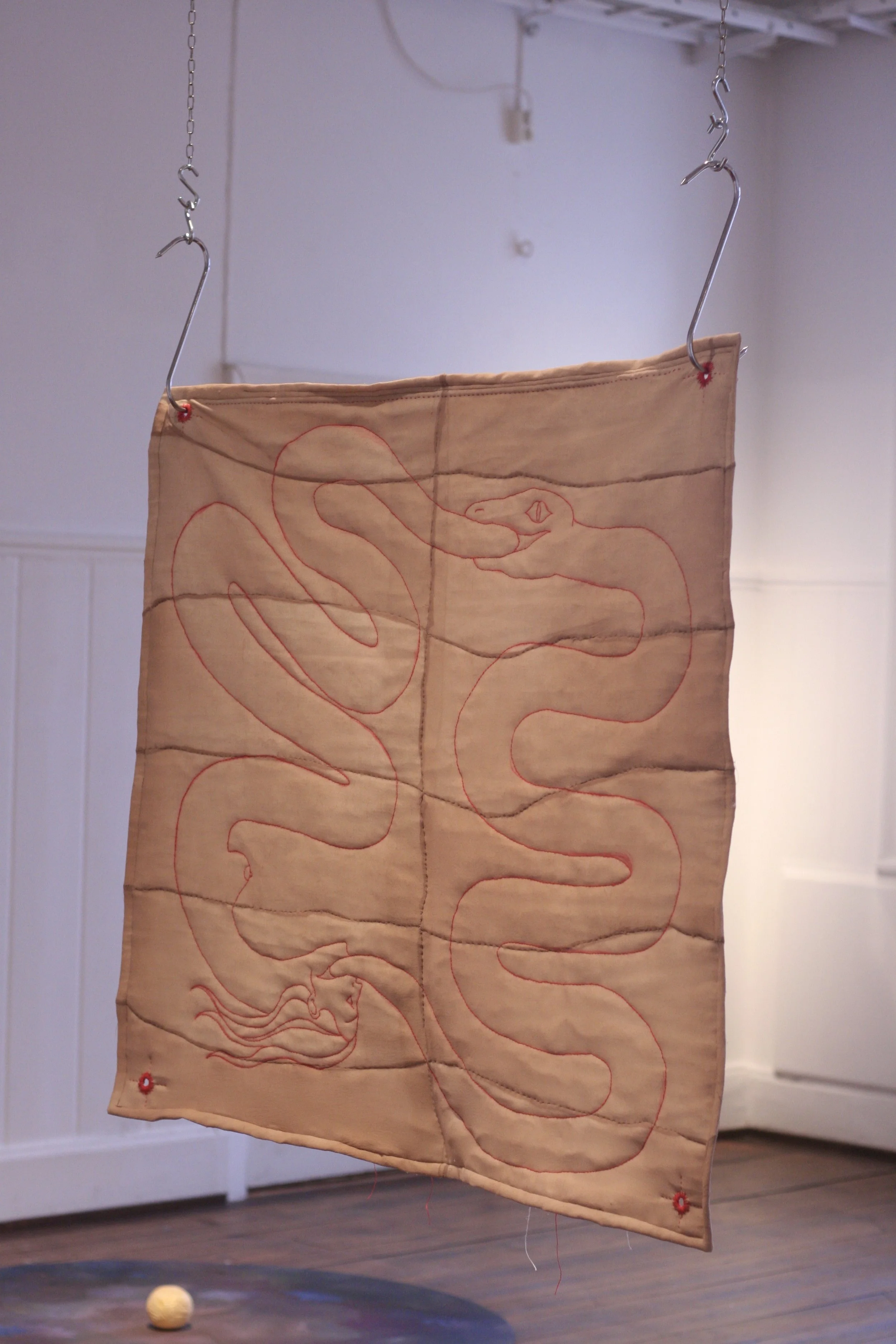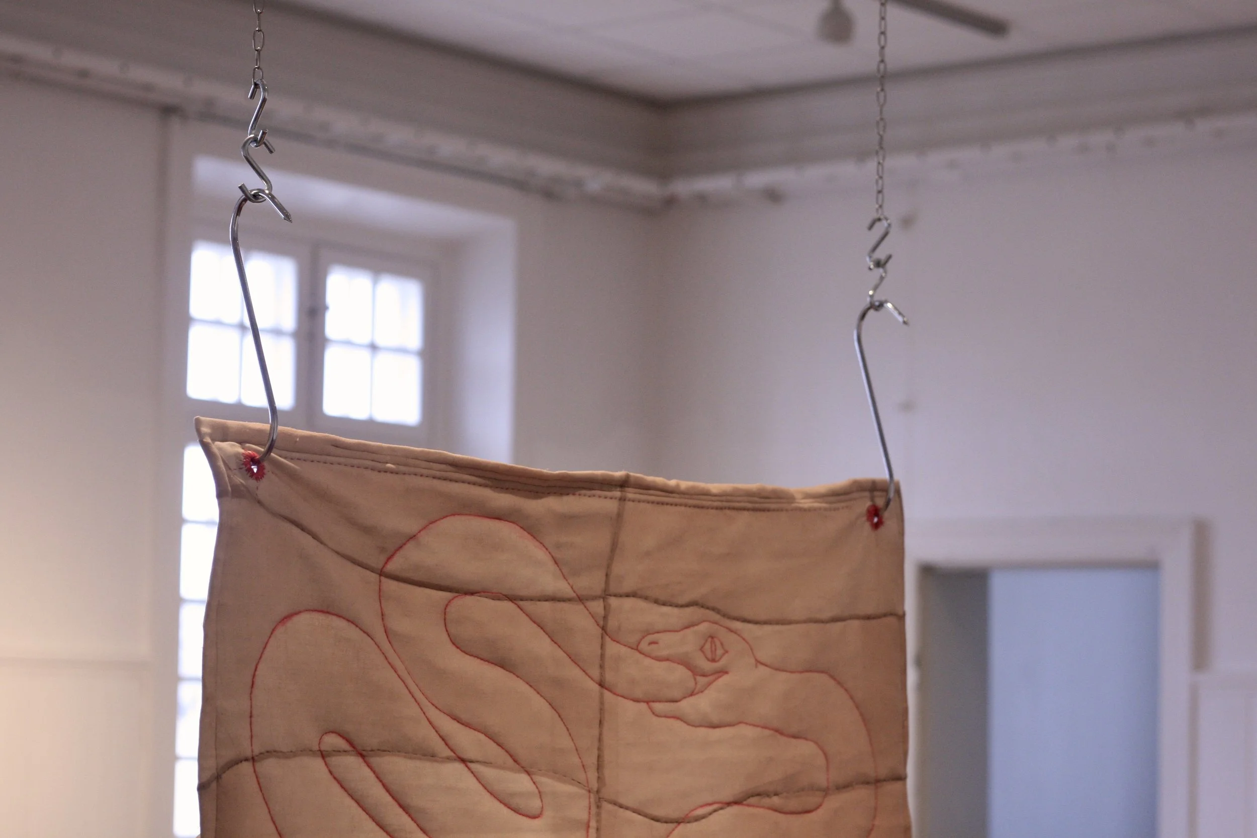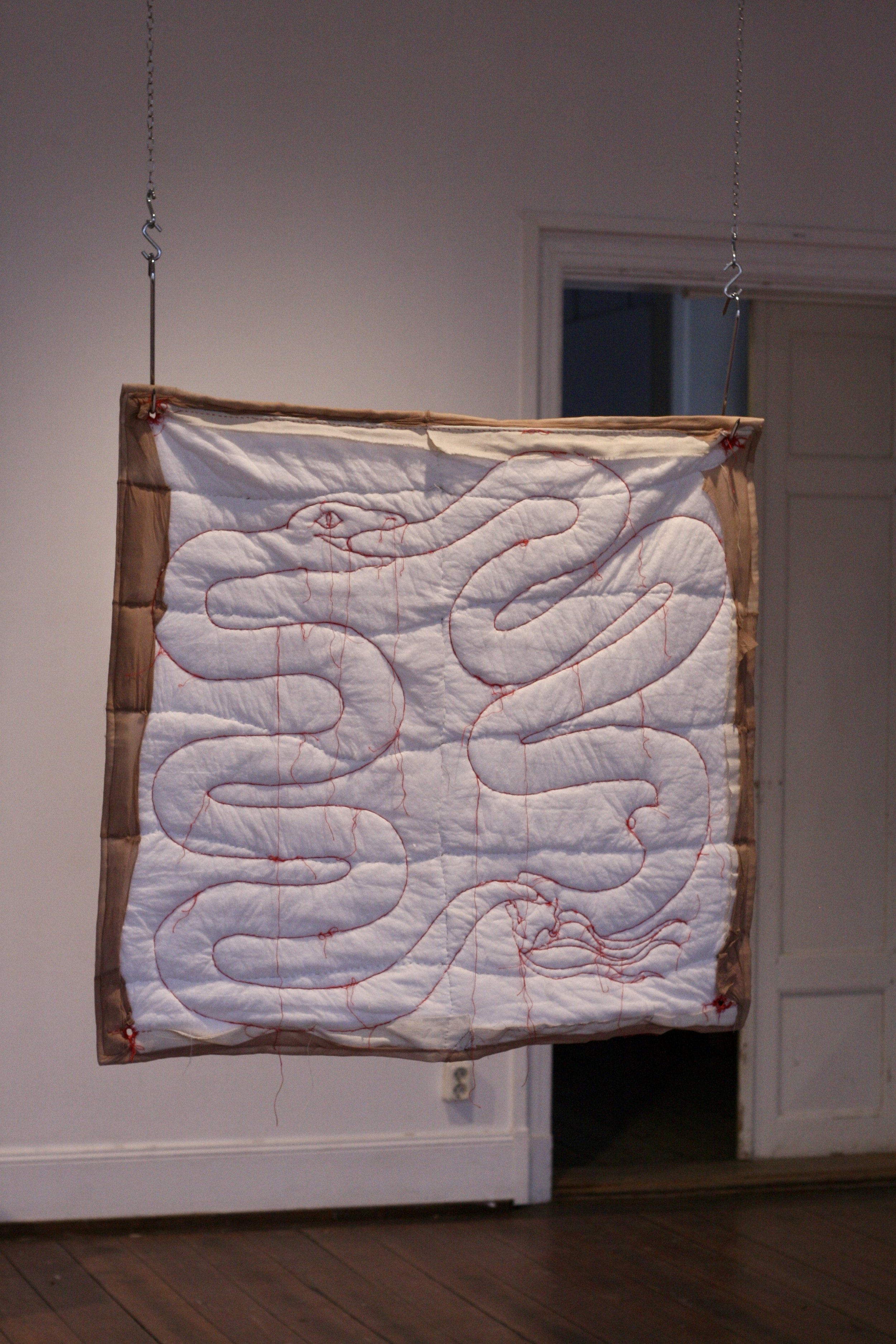 Broderi med röd lintråd, nylonstruppbyxor, bomullsvadd, köttkrok, kedja
