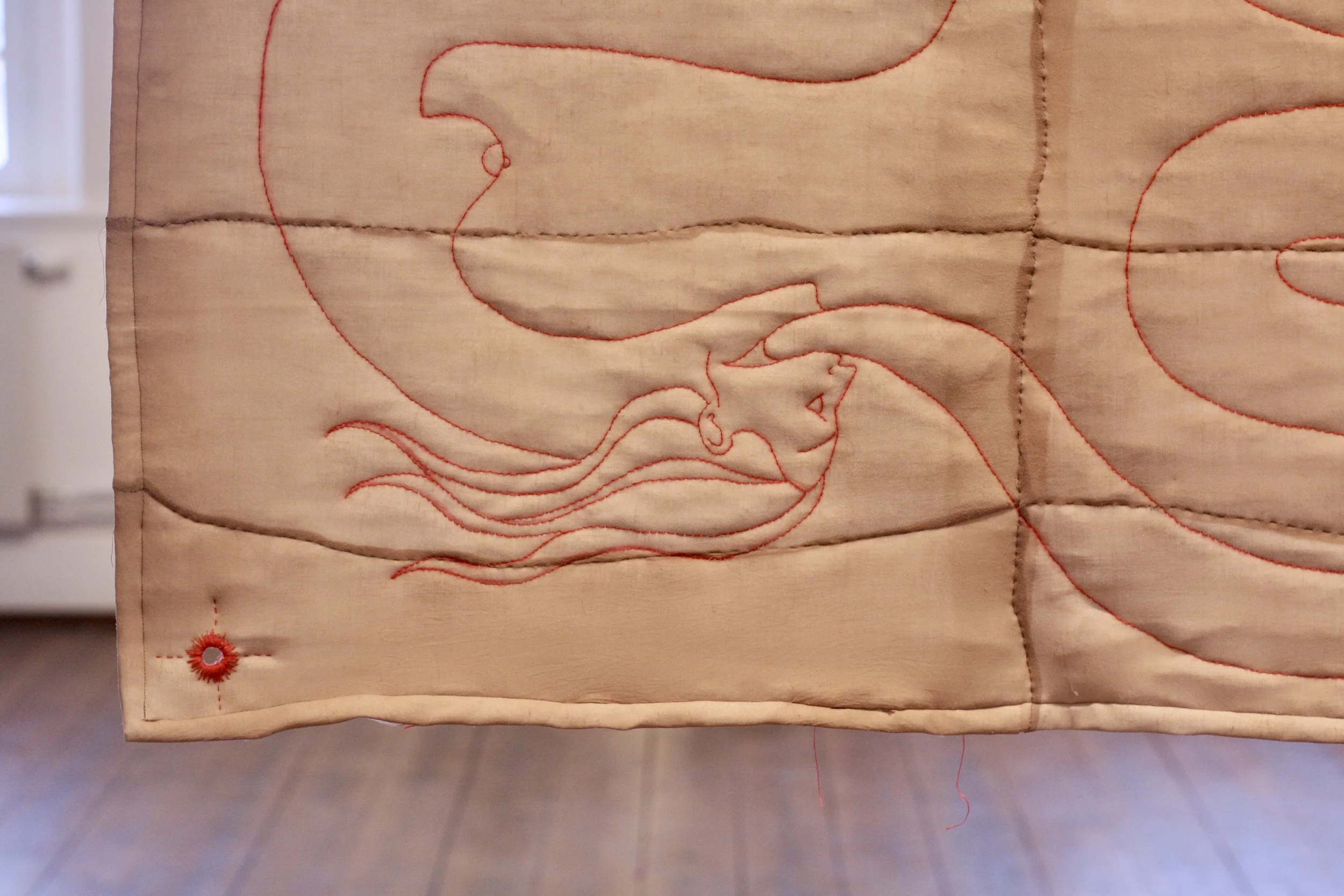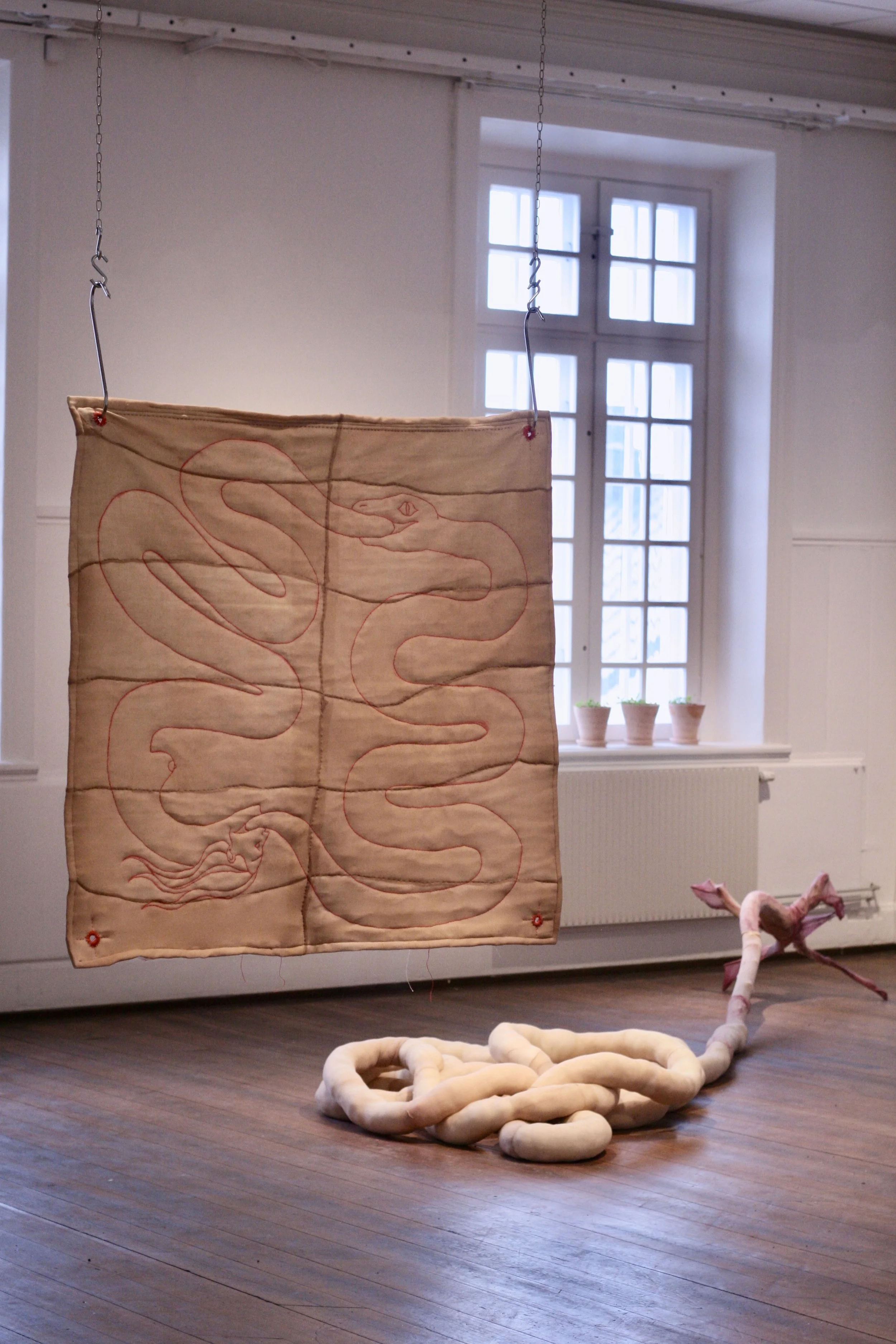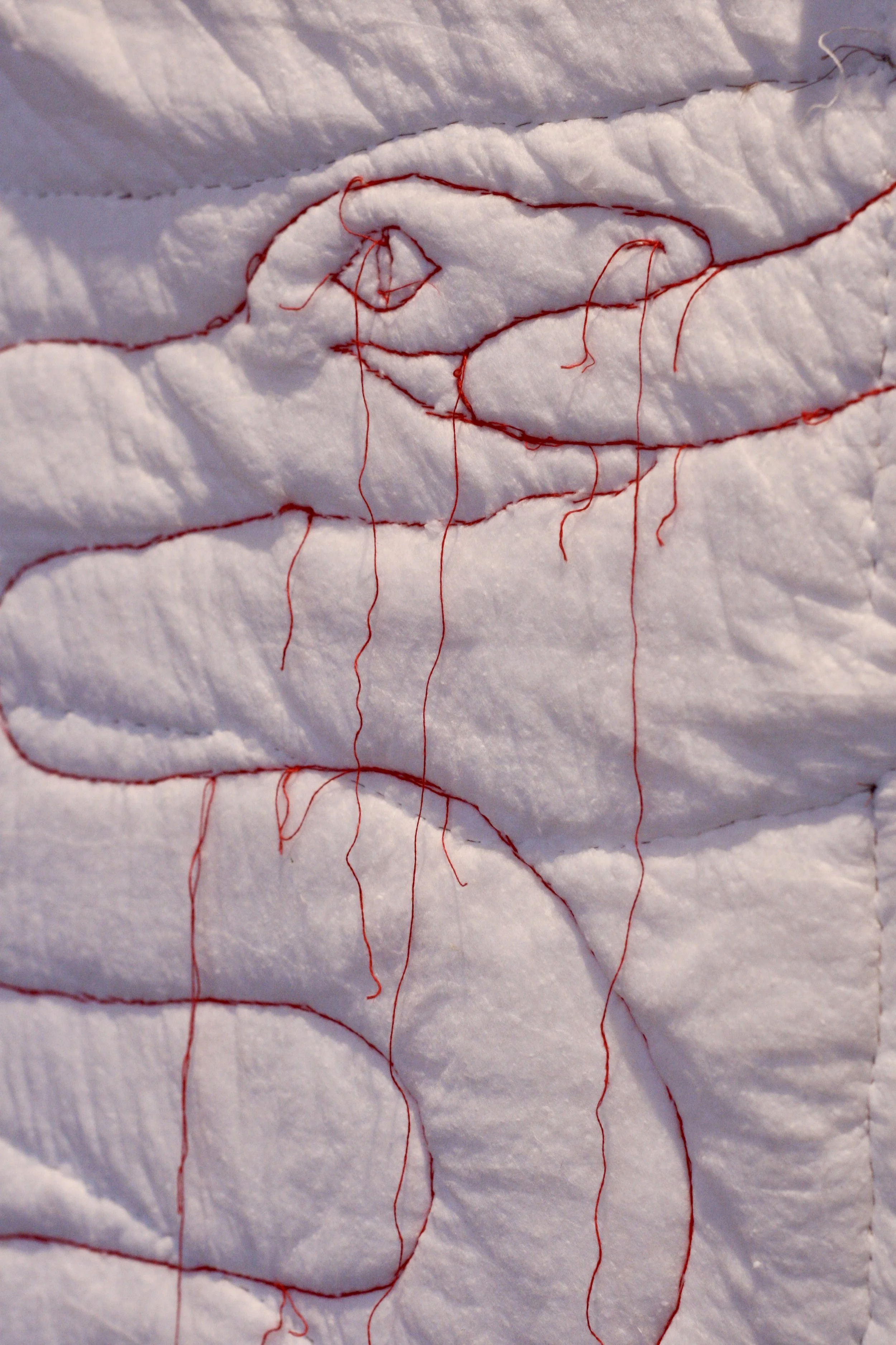 Broderi med röd lintråd, nylonstruppbyxor, bomullsvadd, köttkrok, kedja